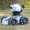 Grâce à sa construction, le char convient pour des voyages en intérieur ainsi que pour l’extérieur sur l’asphalte ou des surfaces similaires lisses et sèches. Ce véhicule de combat est entièrement pré-assemblé. Il suffit d’insérer les piles nécessaires pour la télécommande et la bataille peut commencer.