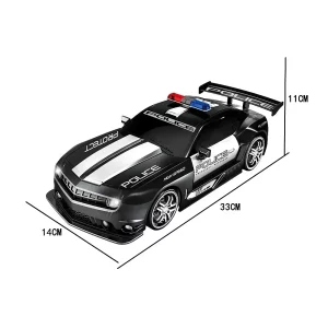 La Voiture de Police Télécommandée mesure 33x14x11 cm. Elle est facile à contrôler grâce à sa télécommande d’une portée de 20 mètres. La voiture peut atteindre une vitesse d’environ 10 km/h.