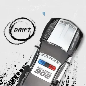 La Voiture de Police Télécommandée présente un design extérieur réaliste avec une finition peinture brillante, des phares LED brillants, un alignement réglable des roues avant et un système de suspension à ressort indépendant. Les jantes chromées foncées avec pneus en caoutchouc ajoutent une touche d’authenticité au produit.